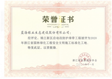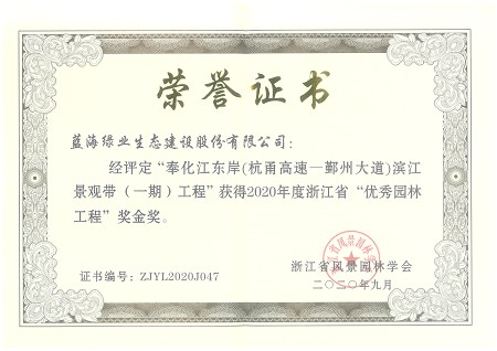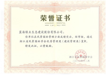 藍海綠業(yè)因在風(fēng)景園林管理成績(jì)突出,經(jīng)評審通過(guò)浙江省風(fēng)景園林協(xié)會(huì )優(yōu)秀管理獎(建設管理類(lèi))復評。