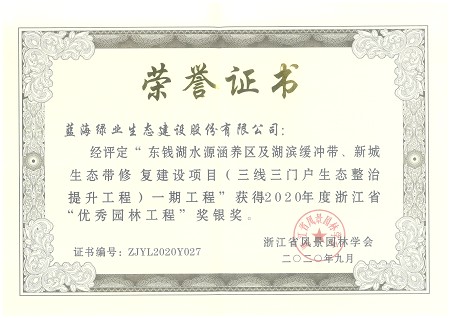 12月11日,由浙江省風(fēng)景園林學(xué)會(huì )主辦的浙江省第十屆“園林人居”論壇暨2020年度“優(yōu)秀園林工程”獎頒獎大會(huì )在杭州舉行,揭曉省優(yōu)秀園林工程項目金、銀獎。至此,藍海綠業(yè)兩個(gè)項目共獲評省、市級園林工程獎“三金一銀”,其中奉化江東岸(杭甬高速-鄞州大道)濱江景觀(guān)帶(一期)工程榮獲2020年度寧波市“茶花杯”園林綠化建設工程優(yōu)質(zhì)獎金獎、2020年度浙江省“優(yōu)秀園林工程”金獎;東錢(qián)湖水源涵養區及湖濱緩沖帶、新城生態(tài)帶修復建設項目(三線(xiàn)三門(mén)戶(hù)生態(tài)整治提升工程)一期工程榮獲2020年度寧波市“茶花杯”園林綠化建設工程優(yōu)質(zhì)獎金獎、2020年度浙江省“優(yōu)秀園林工程”銀獎;姚江新區啟動(dòng)段防護綠帶工程獲評 2020年浙江省園林綠化